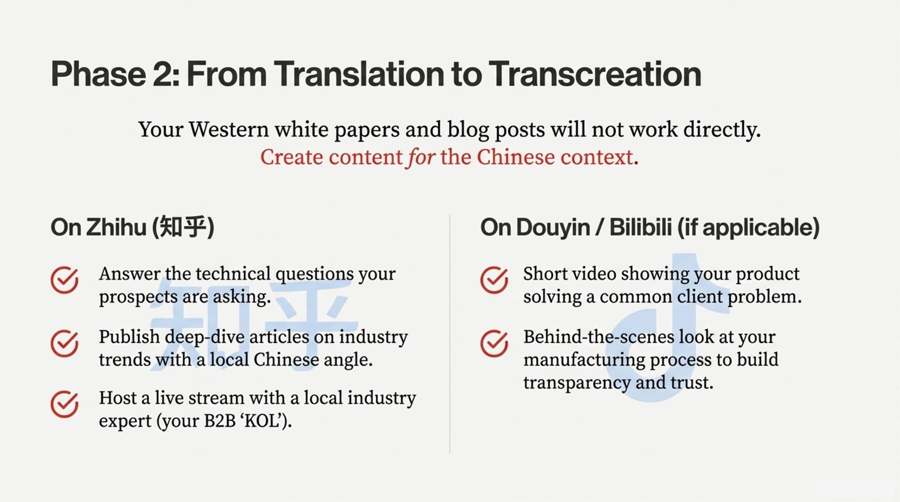 - For a company focused on deep technology or professional services, a pilot program publishing thought leadership articles and answering technical questions on Zhihu would be more appropriate.