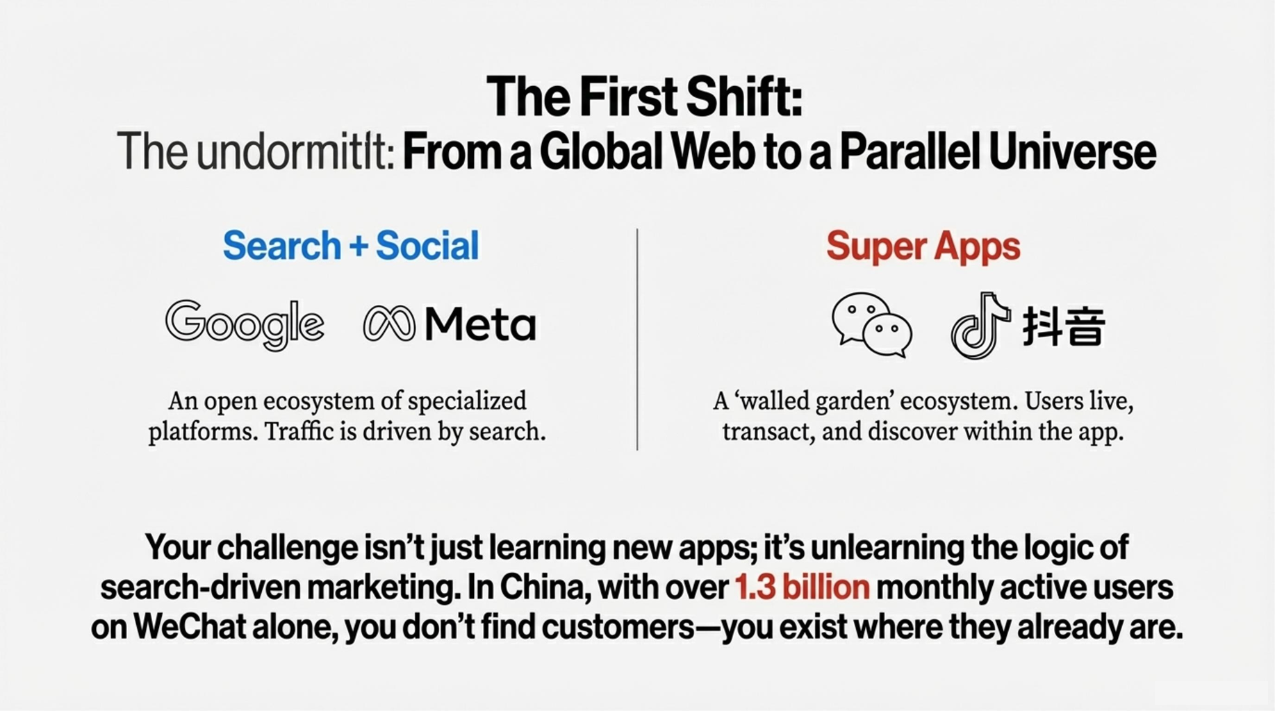 Before selecting a platform, it is critical to understand that the digital philosophy and user behavior in China are fundamentally different from those in the West. Simple one-to-one comparisons, such as “Weibo is the Chinese Twitter,” are misleading and will inevitably lead to flawed strategies. The entire user journey—from discovery to purchase—has been reimagined within a distinct, mobile-first, and highly integrated ecosystem. The following table outlines the core conceptual shifts you must grasp.