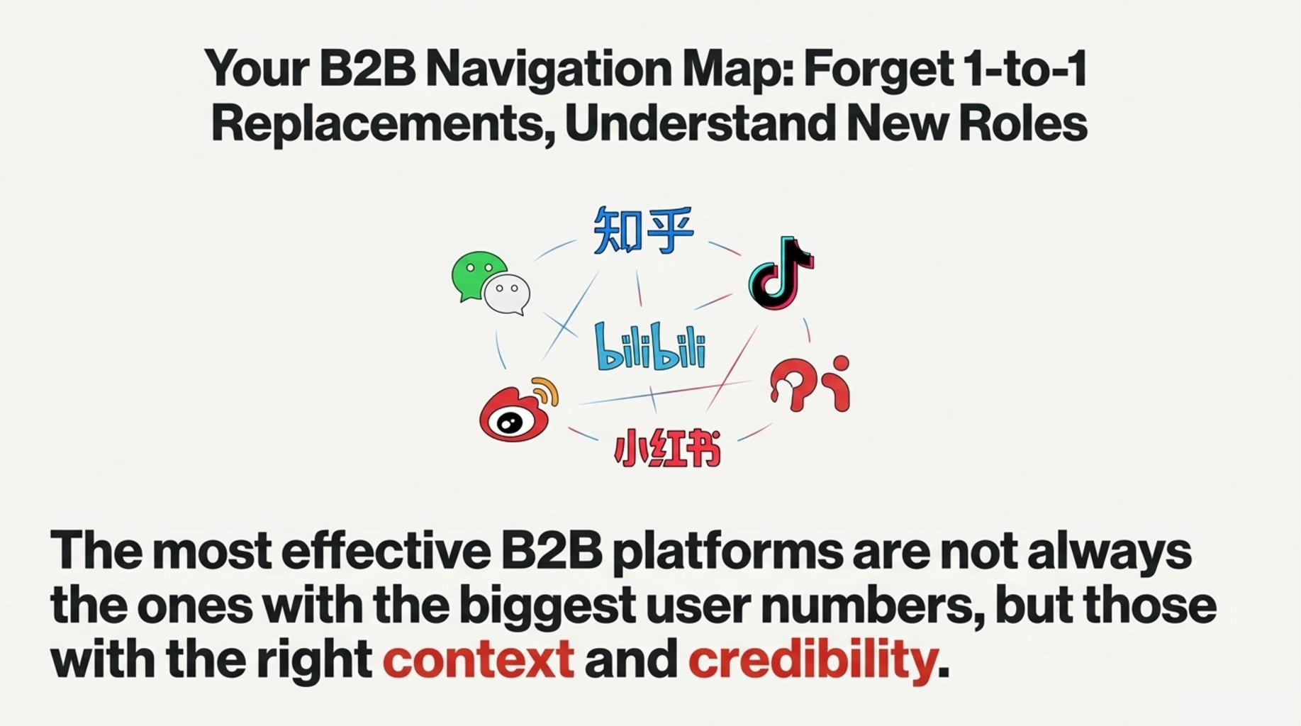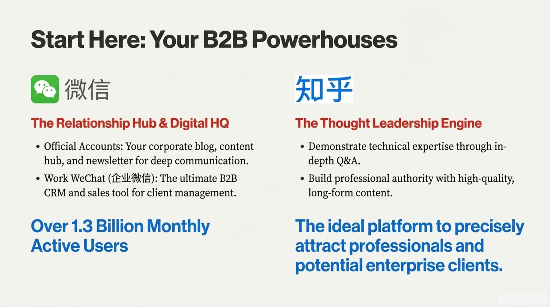 The core principle for platform selection in China is simple: “Go where your users are.” Unlike in the West, where a few major platforms dominate most professional and consumer interactions, China has a diverse ecosystem where different platforms serve distinct user bases and purposes. This section analyzes the most relevant platforms through a B2B lens to help you establish your initial presence.
