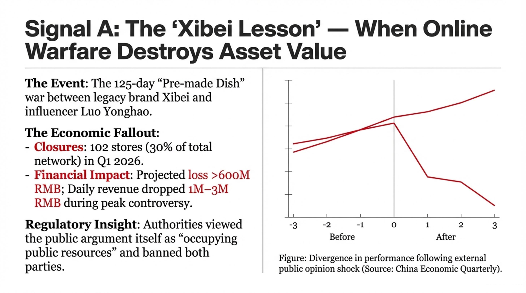 - Pivot from Confrontation to De-escalation Aggressive public relations tactics, such as publicly denouncing critics, are now extremely high-risk activities that can trigger regulatory intervention. As seen in the Xibei case, a confrontational stance can escalate a manageable issue into a brand-destroying crisis. The 600 million RMB loss incurred by Xibei should be viewed as the new cost of a single, poorly-managed public argument. Companies must develop clear de-escalation protocols for handling public criticism, focusing on transparency, good-faith dialogue, and finding common ground rather than winning arguments.