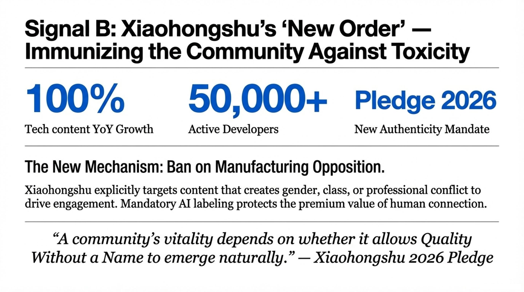 The success of this strategy is vividly illustrated by the recent migration of China’s tech community to the platform. In 2025, the number of tech content creators on Xiaohongshu grew by over 200%. Companies like the AI agent startup Flowith now use the platform as a “community as a laboratory,” where the “strong sense of real people” allows them to gather authentic user feedback and iterate on their products in a constructive environment. This “community as a laboratory” model thrives specifically because the platform’s rules suppress the “toxic friction” and “hostility” that would otherwise make public product development untenable. Tech entrepreneurs are not just finding users on Xiaohongshu; they are finding a sanctuary from the very flame wars that regulators are now extinguishing elsewhere.