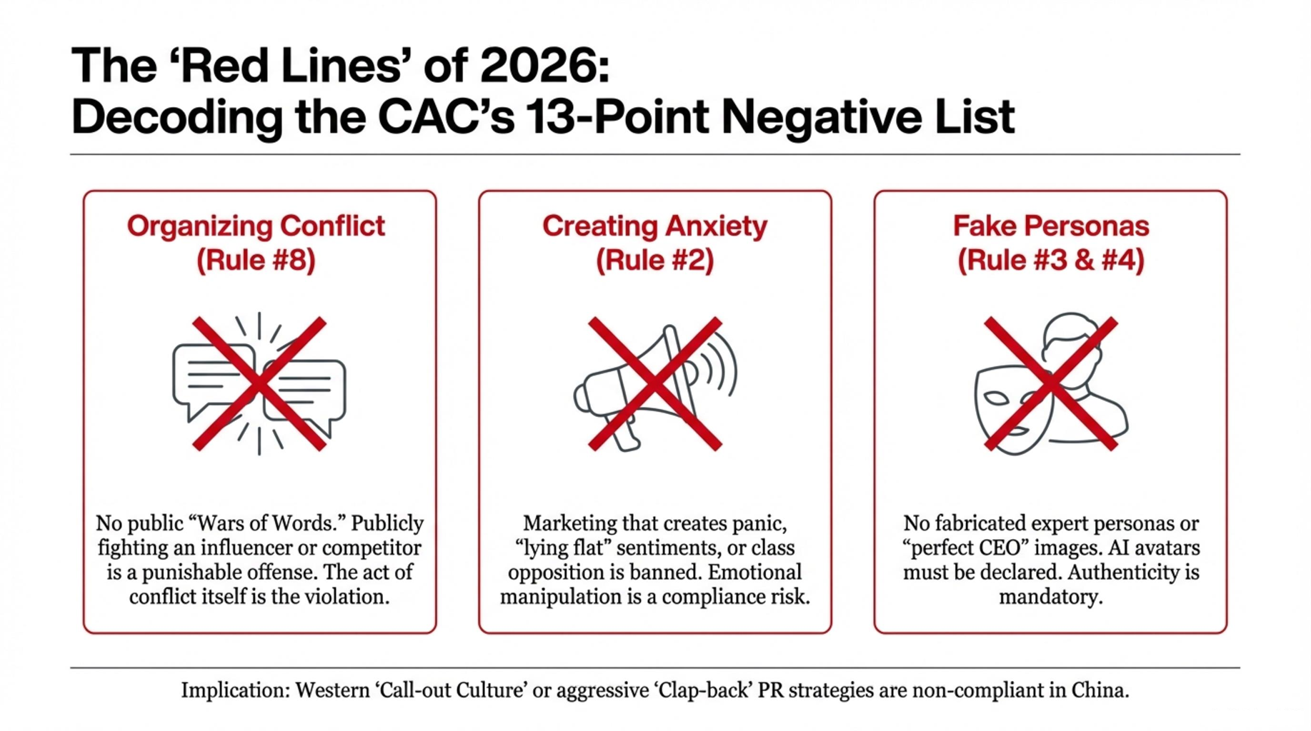 The primary regulatory instrument is the “Negative List for Online Celebrity Account Behavior,” issued by the Cyberspace Administration of China (CAC) in December 2025. This document explicitly outlaws specific types of online behavior. From a risk management perspective, these represent new, non-negotiable tripwires for brand reputation. For businesses, the three most critical prohibitions are: