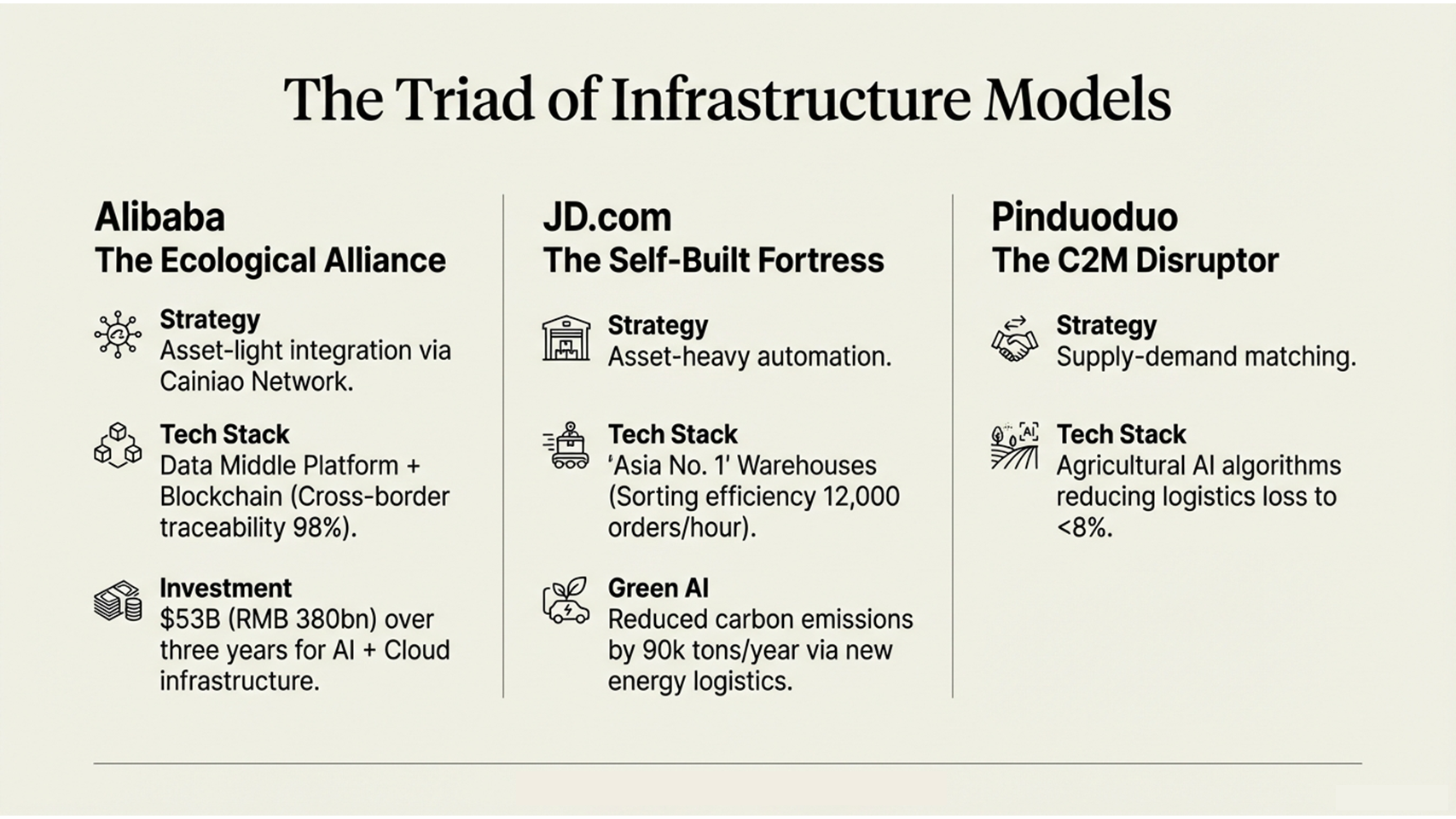 The 2024–2025 period marks a definitive transition into “Ecological Symbiosis,” where AI acts as the connective tissue for disparate business units. Alibaba, JD.com, and Pinduoduo have constructed divergent yet integrated AI foundations that Western brands must navigate with precision.