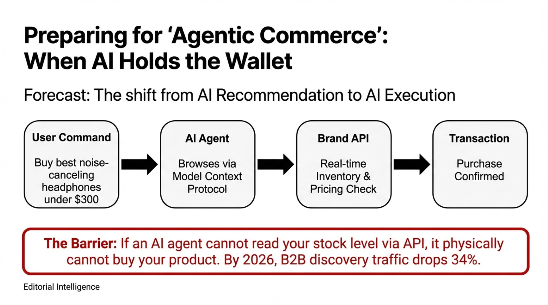 - Agentic Commerce API Readiness: If an AI agent cannot “read” your pricing and specs via a structured API, your brand is physically excluded from the autonomous purchase loop.