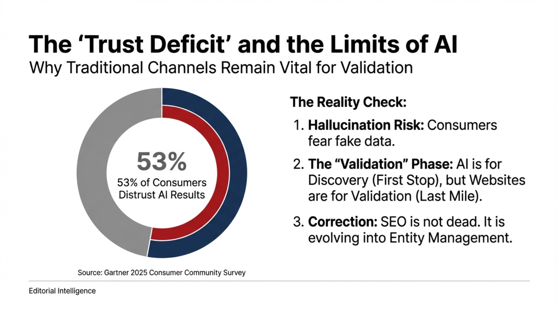 - Maintain Traditional SEO as a Secondary Anchor: Because 53% of consumers still distrust AI-only results, your website must remain a high-authority “Truth Source” for the final 10-19% of the journey (Verification and Conversion).