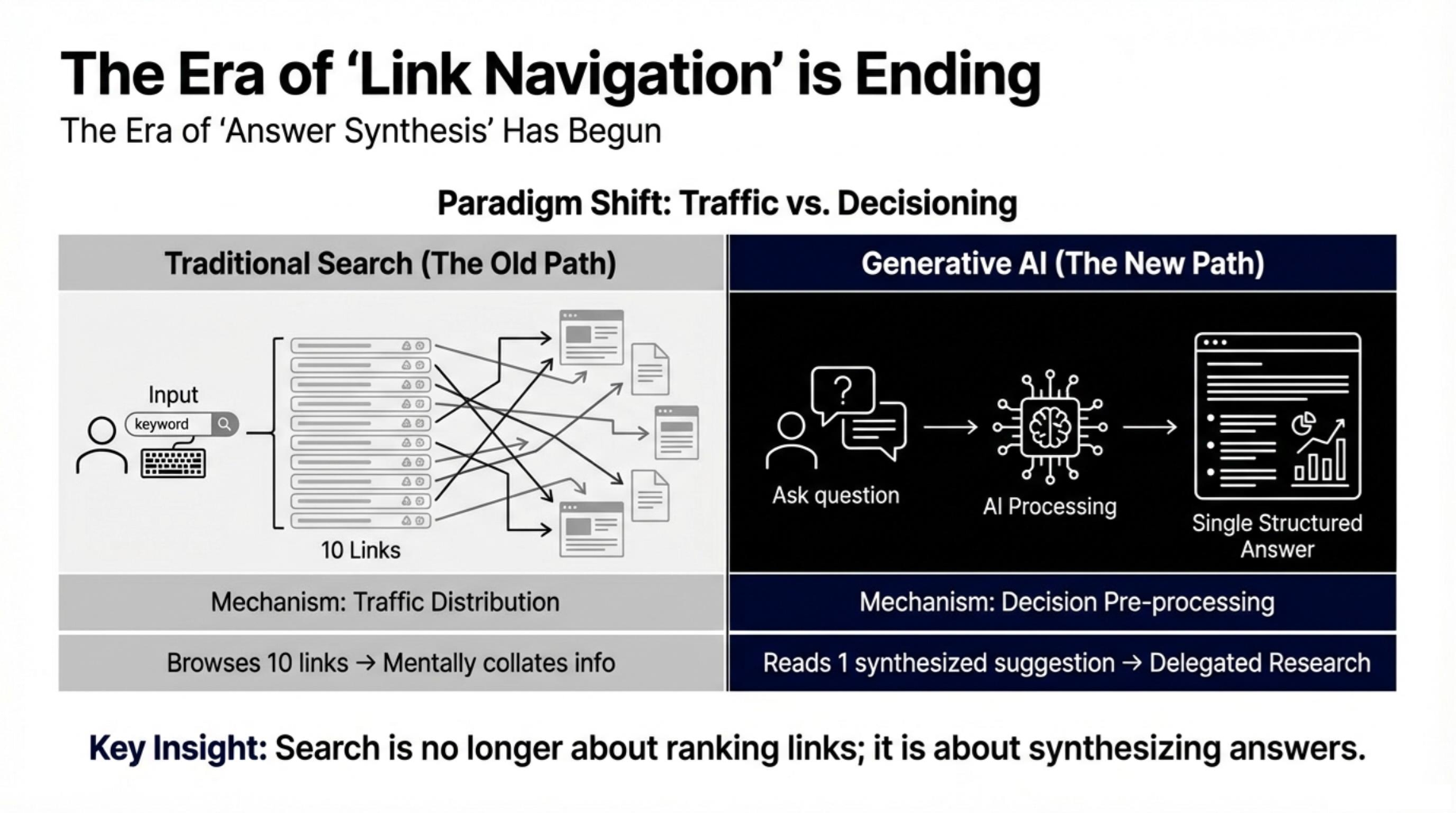 - The Fact: Consumers have migrated from “searching for links” to “receiving synthesized answers.”