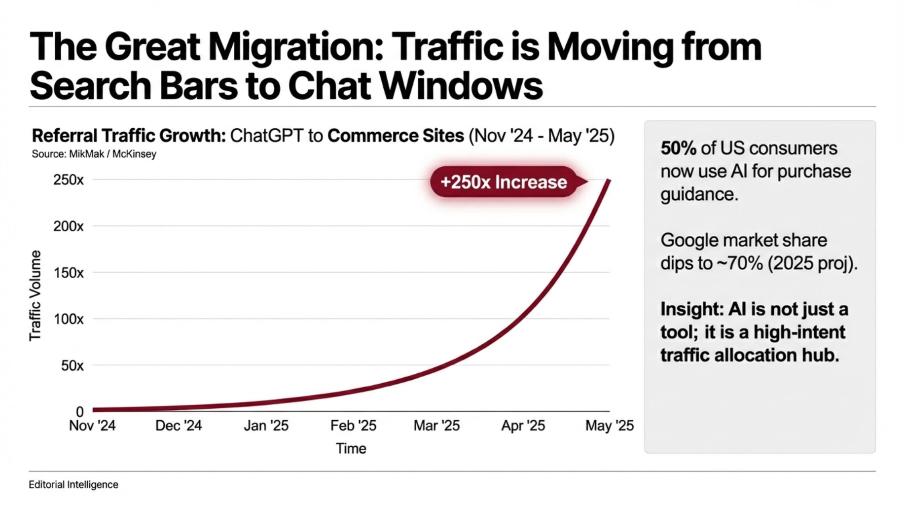 - The Industry Data: McKinsey reports 50% of US consumers use AI tools to guide purchases. MikMak data confirms a 250-fold (25,000%) growth in traffic from ChatGPT to e-commerce destinations within a six-month window.