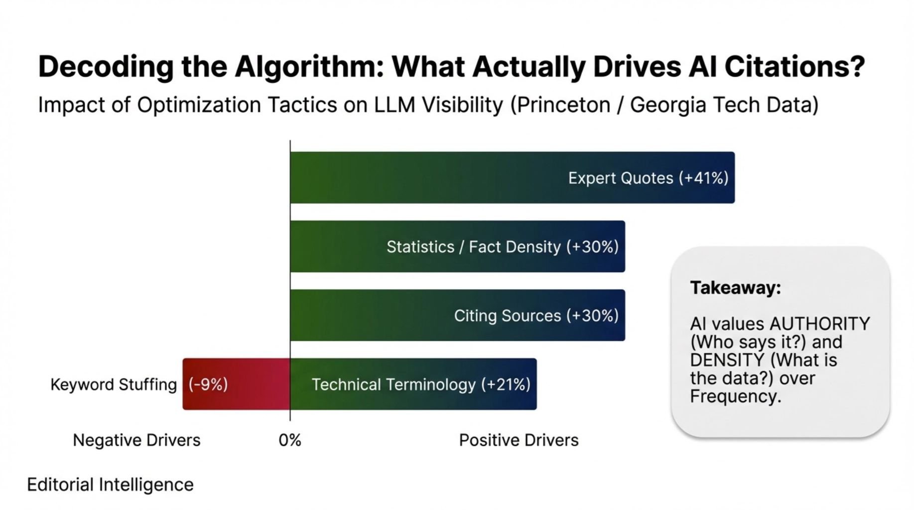 - The Penalty of “Marketing Fluff”: Research from Princeton University and Georgia Tech confirms that “keyword stuffing” results in a 9% negative visibility correlation. Brands relying on legacy SEO fluff are being actively de-prioritized by LLMs.