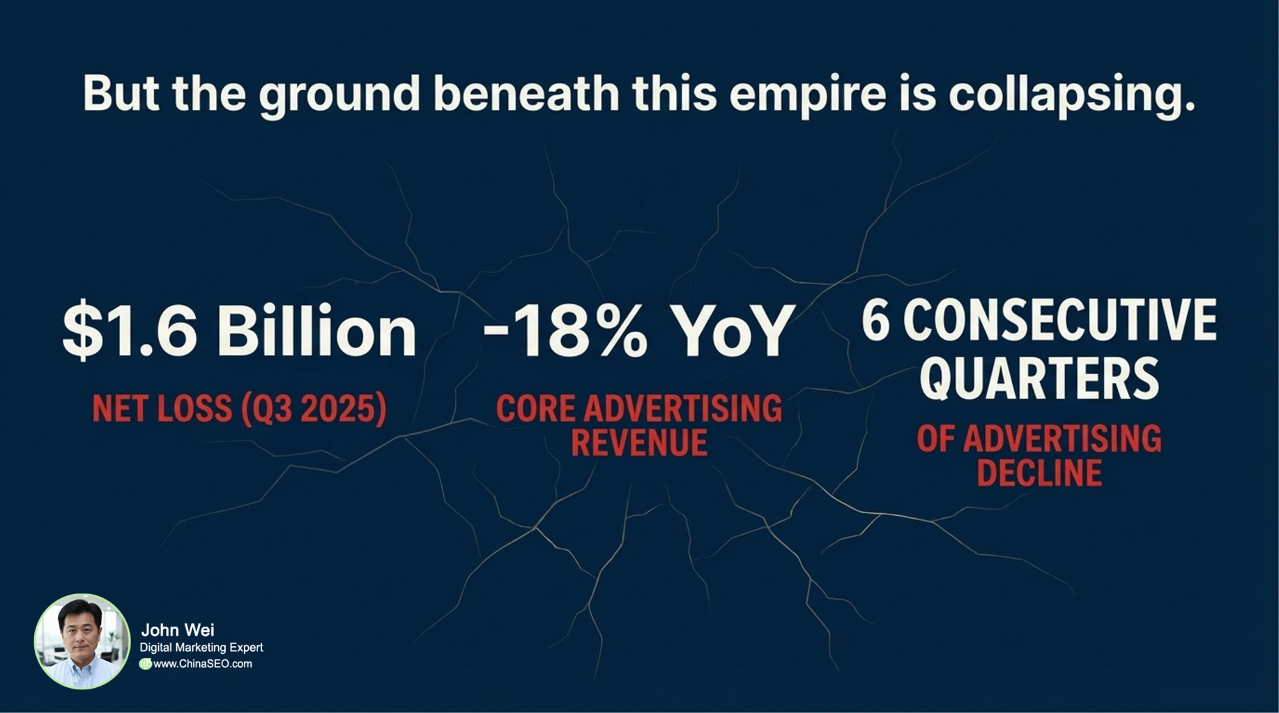 - Revenue Plunge: In Q3 2025, online marketing revenue fell by a staggering 18% year-over-year to 15.3 billion yuan, marking the sixth consecutive quarter of decline.